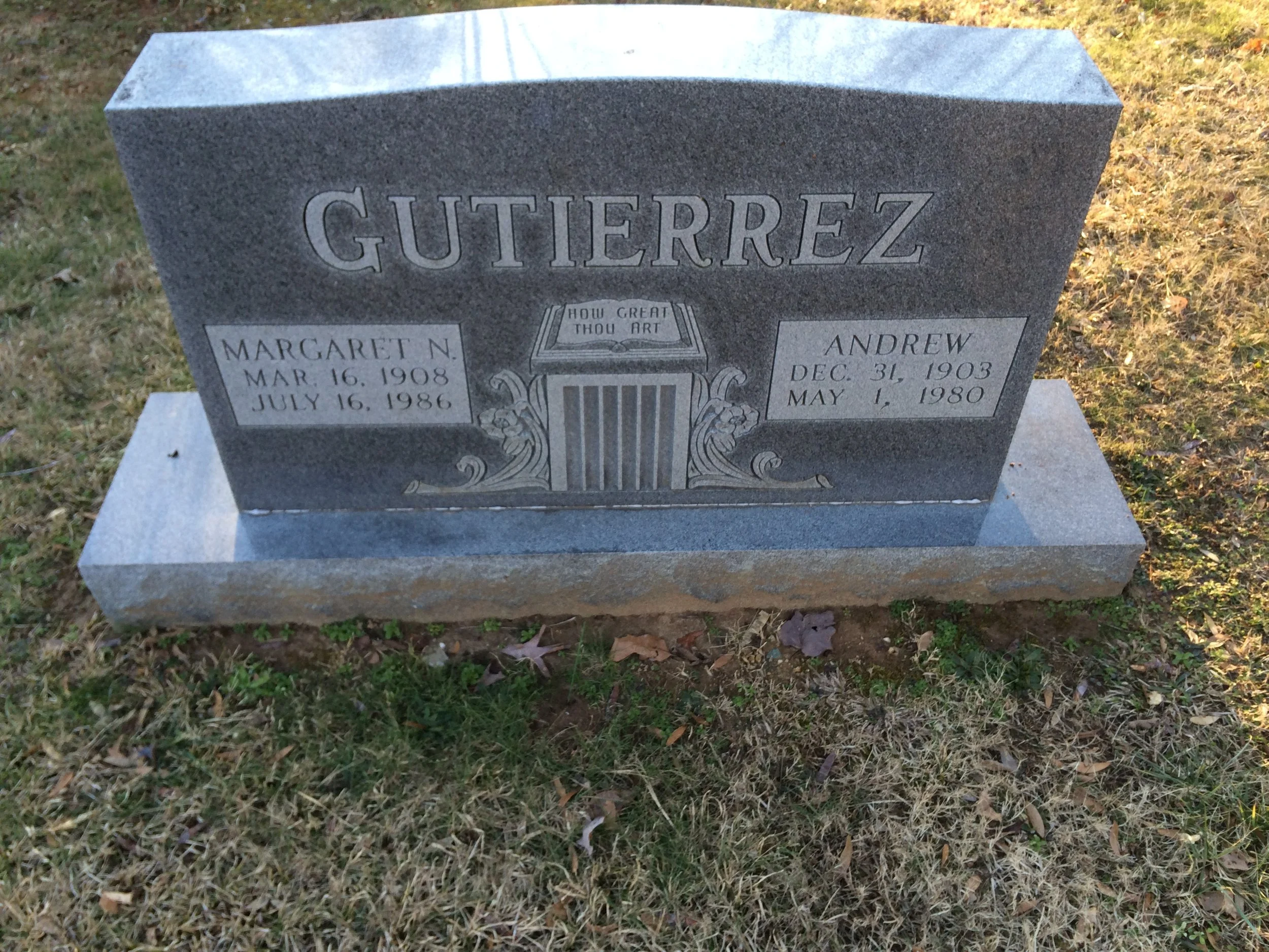 Andrew Gutierrez was born on New Year’s Eve 1903 in Santiago, Cuba to Jose and Emma Gutierrez. He was given the first name Andres, a name he carried to the United States aboard the SS Munargo, which dropped him in New York on June 27, 1922. He went on to attend the University of North Carolina and became a Civil Engineer. On Christmas Eve of 1924, he married Margaret Nesbitt, 17, whose family had been in Chapel Hill for a generation. You can still see the Nesbitt name on certain business in the area. At some point, they moved to Urbana, Illinois, where there first child Andrew was born in 1925. Three more children followed: Joseph, Rosita, and Margaret. Some time in the late 20s, the family moved back to Chapel Hill, where Andrew worked as an engineer at the Durham County Water Department. Later, he moved to Alexandria, Virginia, where he worked for the D.C. government. He died in Virginia in 1980 of Acute Pulmonary Ademaand Parkinsons.